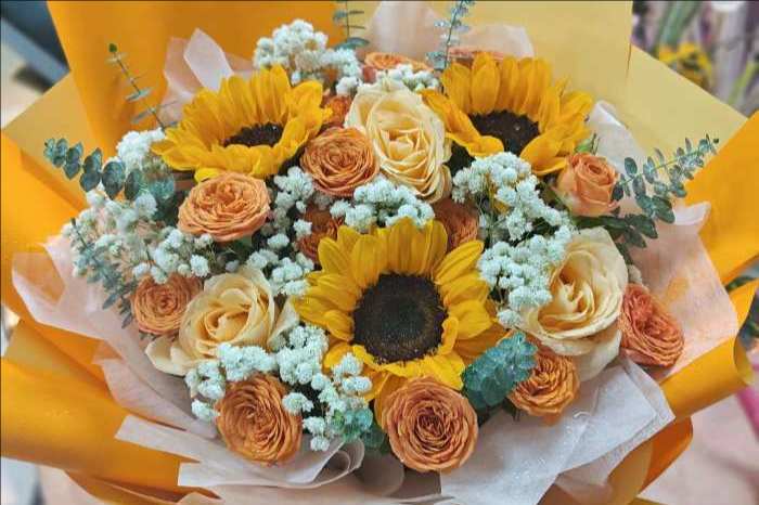 【花材】3枝向日葵、3枝香槟玫瑰搭配3枝橙色多头玫瑰、白色满天星、尤加利叶;